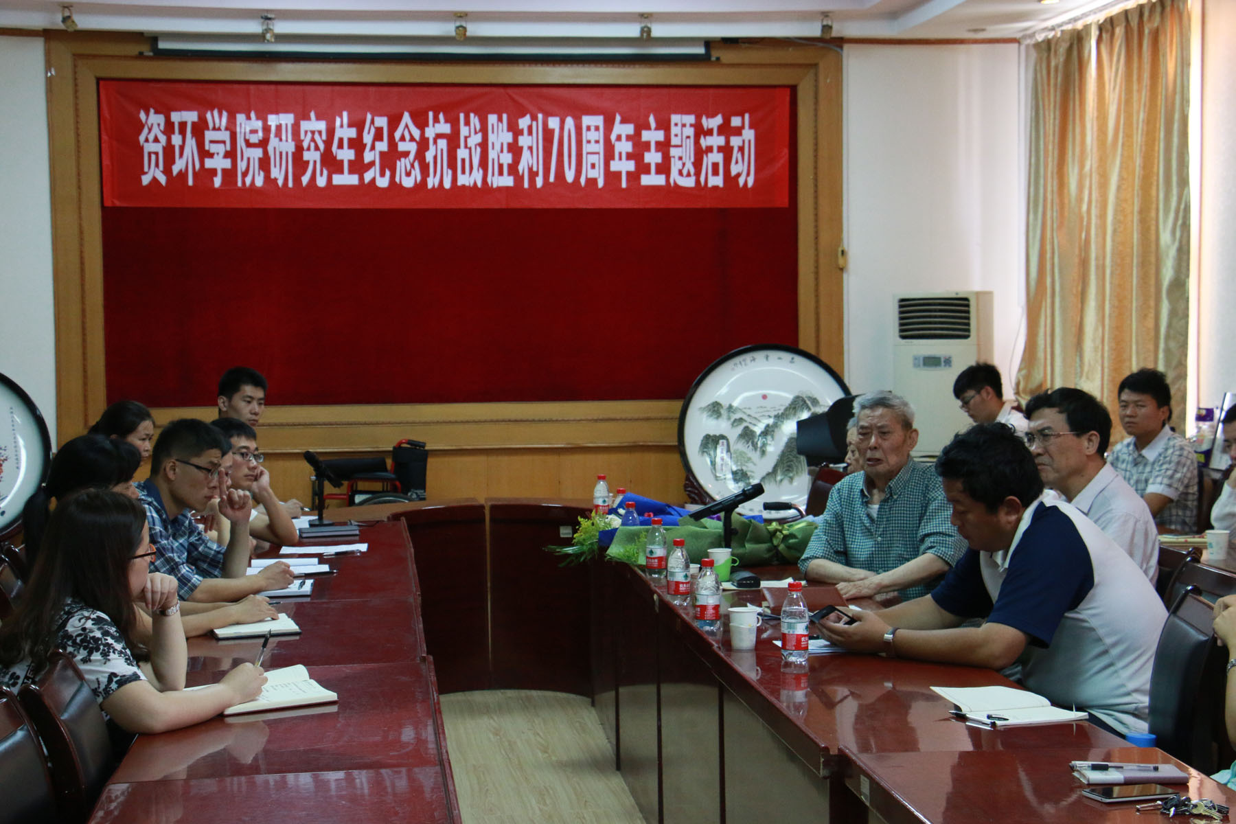 “我亲眼看到了日寇残暴的扫荡和灭绝人性的侵略,你们一定要铭记历史啊”,88岁的黄鼎老师动情的说。为纪念中国人民抗日战争胜利7 0周年暨世界反法西斯战争胜利7 0周年,9月1日上午,资环学院举办了以“缅怀先烈,继承遗志,弘扬爱国主义精神”主题纪念活动。我校革命老兵、离休老干部黄鼎老师其夫人丛老师、学院党委书记于林、副院长齐伟、党委副书记冯国营出席了活动。学院研究生党支部、本科生党支部师生党员、入党积极分子、部分研究生代表参加了活动。