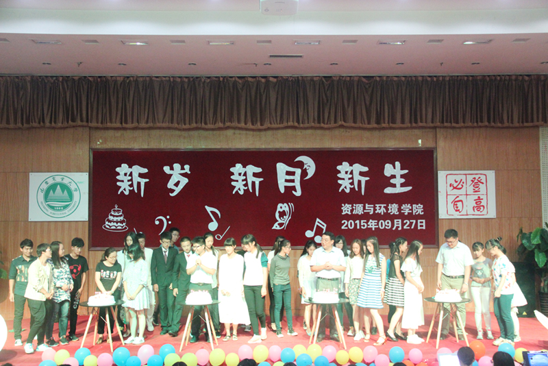 除了精彩的节目,学院还别出心裁地推出了成人礼教育活动,特地采用为新生庆生的形式,完成了学院的成人礼,成为中秋晚会的重要环节。活动伊始,35个九月份过生日同学身着靓丽服装,以模特走秀形式绚丽登场,现场欢呼声、尖叫声不断,气氛迅速升温。随后,学院领导上台与学生一起吹蜡烛、许愿,互道祝福。学生围绕在老师身边,与老师一起见证这美好时光,场面温馨感人。学院党委副书记冯国营老师为新生致辞道:“我希望你们尽快融入资环大家庭,在这个家庭里茁壮成长,成为我们的骄傲!”参与其中的新生留在台上谈及成人感受时,激动地说道:“感谢父母赐予我们生命,十八岁意味着已经成人,我们应该肩负起责任,追求梦想,实现人生价值”。随后,全体新生在主持人的带领下共同宣誓,高喊:“十八而志,青春万岁!”学生宣誓声音洪亮,慷慨激昂,充分显现了我院学生的崭新风貌。