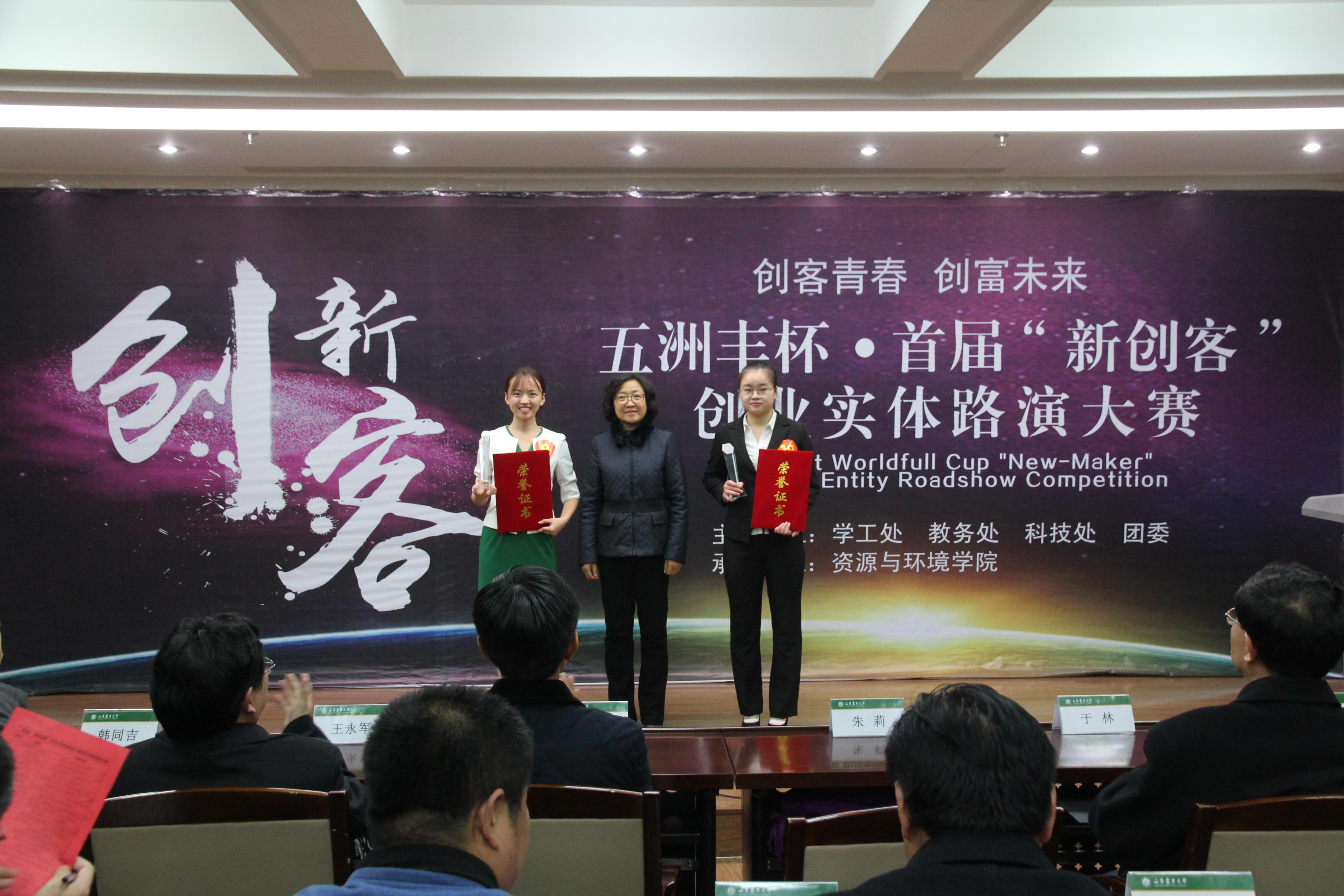 12月22日,学校首届“新创客”创业实体路演大赛在北校区落下帷幕。经过激烈角逐,资环学院“泰安市兰德格润农业科技有限责任公司”、林学院“泰安市泰山区新丝路生物科技有限公司”获得大赛一等奖,朱莉校长参加大赛颁奖典礼并为获奖团队颁奖。