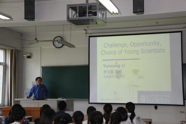 为拓宽齐鲁学堂学生的国际视野,与国际科学前沿接轨,6月10日,学校特邀资源与环境学院客座教授——美国佛罗里达大学国际知名专家李允聪教授为齐鲁学堂学生开展了题为“Challenge, Opportunity, Choice for Young Scientists”讲座,齐鲁学堂50多位同学聆听了此次讲座。