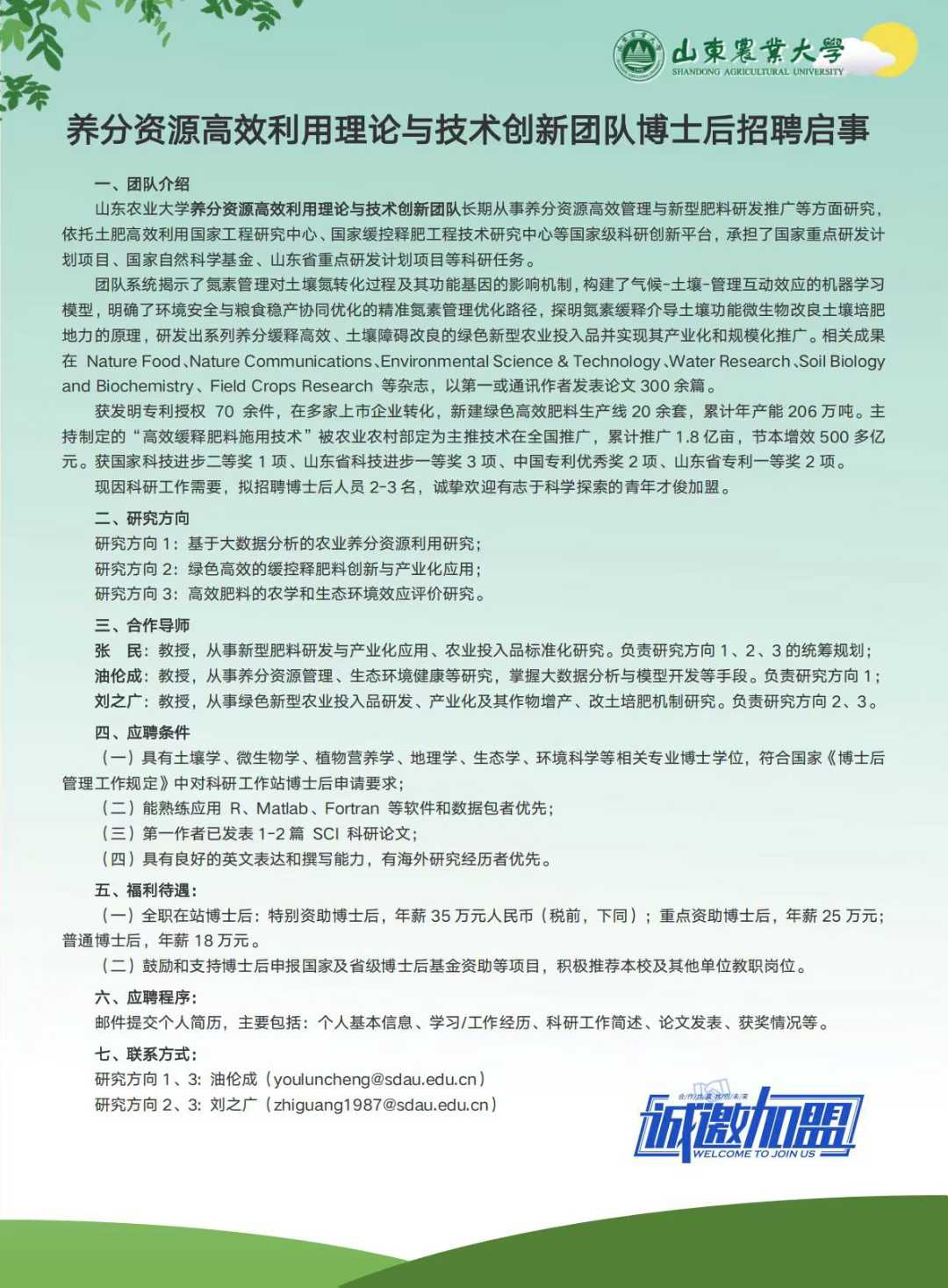 养分资源高效利用理论与技术创新团队博士后招聘启事(长期有效;2025.12.07 更新)