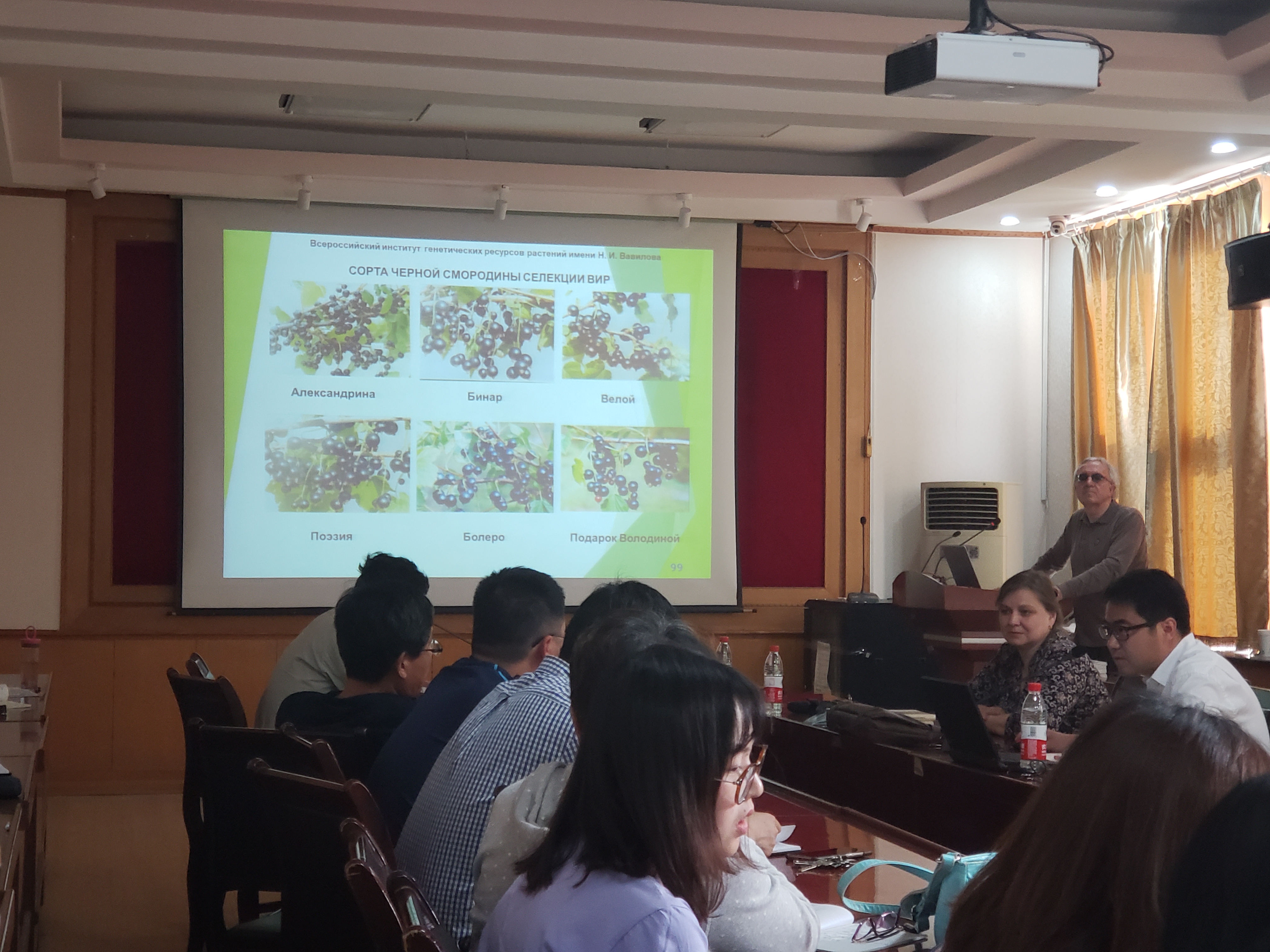 尼古拉•久班克的报告围绕瓦维洛夫作物资源展开,以世界植物遗传资源和它们的野生同族的重要引进方向作为概述,详细介绍了植物学、进化、系统发育学和植物分类、遗传、生理、生物化学免疫性、农业气象、分子生物学等方面新的基础理论知识,并在此基础上开发高效育种的工艺,图文并茂地讲述了高效育种工艺对当代生产生活的重要意义,同时对我校育种工作表现出极大兴趣,并欢迎资环研究生们前往瓦维洛夫全俄植物遗传资源研究所交流学习。